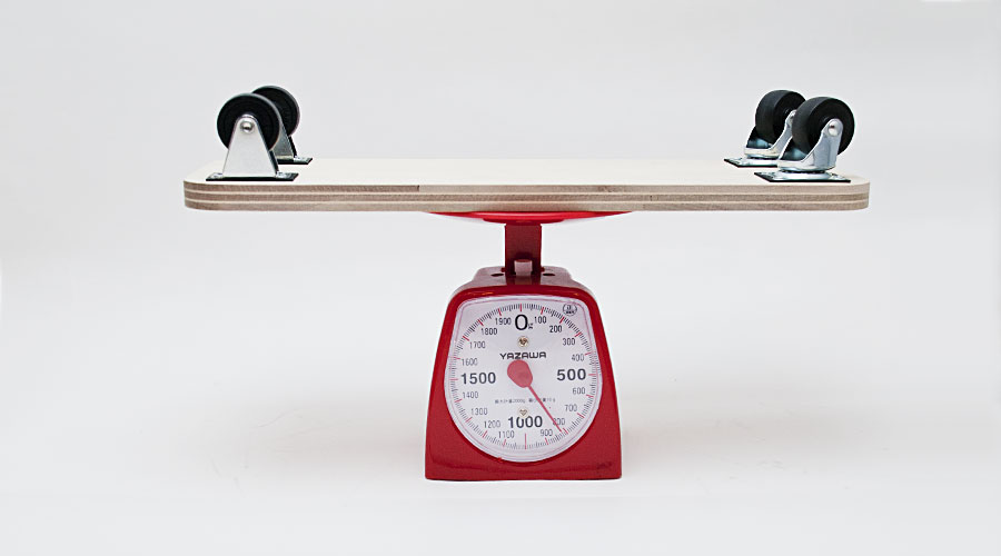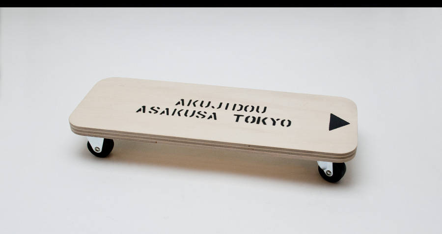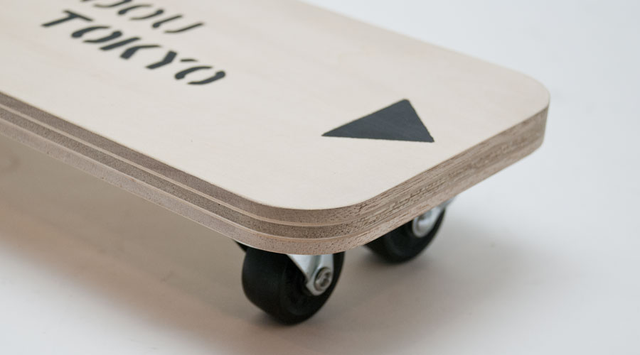 このベースになっているシナ積層合板は4枚張り合わせたモノ。強度なども考慮しつつ、このボードの為に制作して頂きました。制作して頂いたのは以前「男のペンシルホルダー」の木製オープナーを作って頂いた、北海道の「鈴木公房」さん。この厚さ17ミリの合板はかなり丈夫で30kg程度までの加重なら十分耐えられます。このボードに付けたタイヤも前を可動式にしてあり、操作性がとても良くなっています。