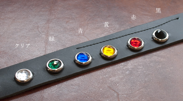 ランダムに打ち込んだ色ちがいの角鋲にラインストーンが絡んだデザイン。スタッズの配色も個体毎に少しずつランダムに色を変えてお作りします。